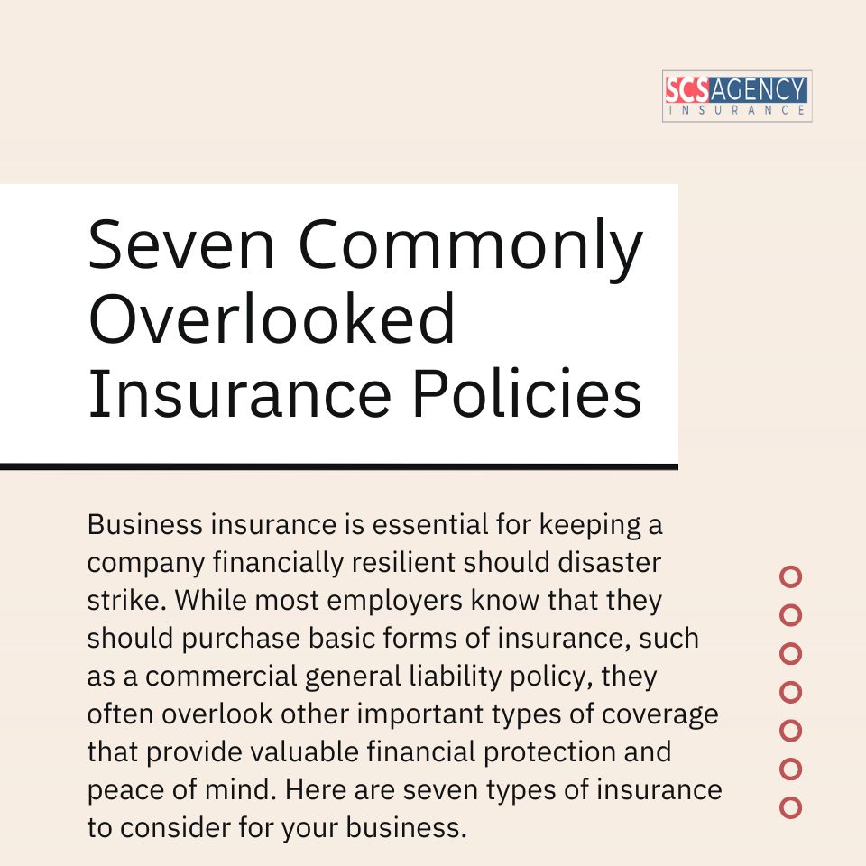 Business insurance is essential for keeping a company financially resilient should disaster strike. While most employers know that they should purchase basic forms of insurance, such as a commercial general liability policy, they often overlook other important types of coverage that provide valuable financial protection and peace of mind. Here are seven types of insurance to consider for your business.