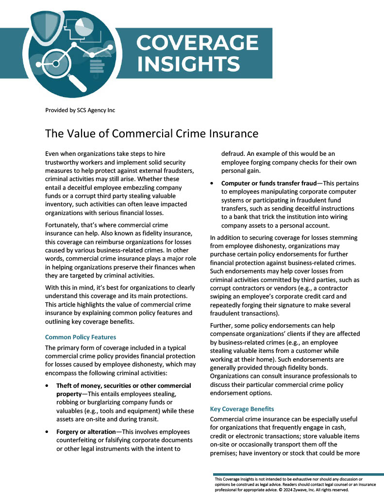 Commercial crime insurance, also known as fidelity insurance, protects organizations from financial losses caused by internal and external criminal activities such as employee theft, forgery, and fraud. This coverage is crucial for maintaining financial stability, fulfilling legal obligations, enhancing credibility, and providing peace of mind.