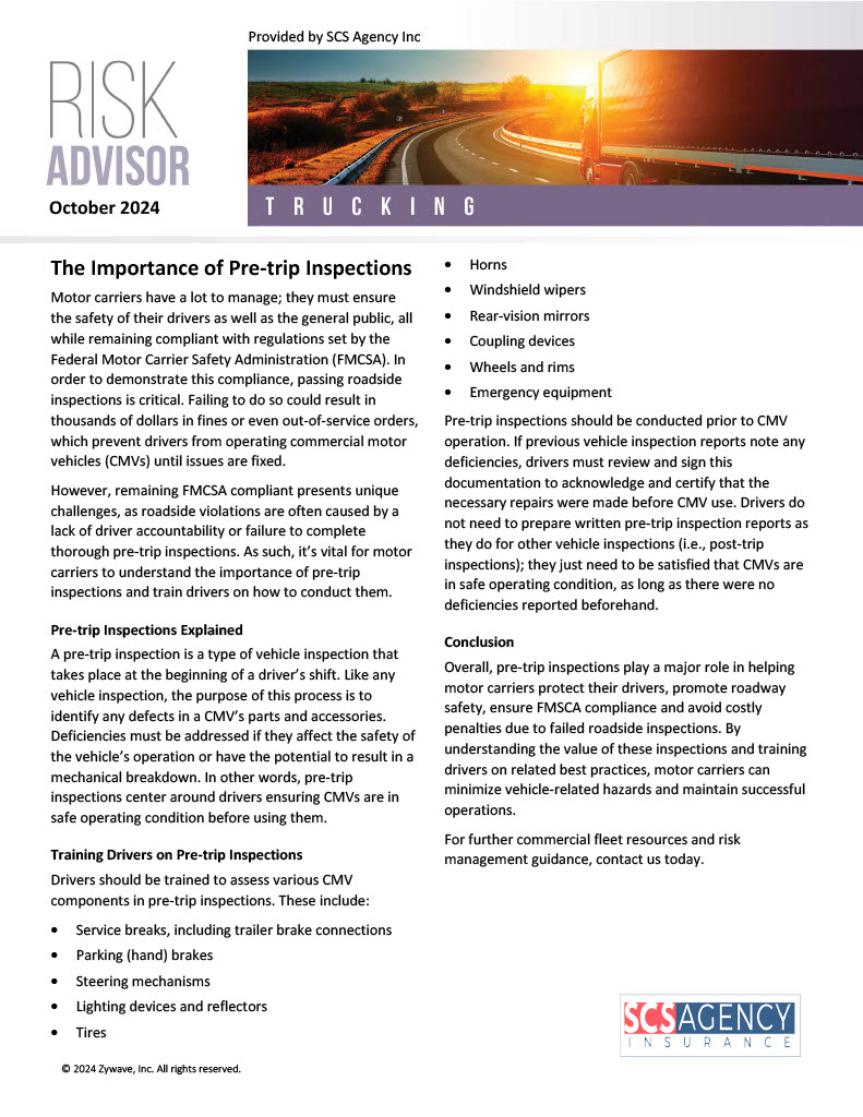 Pre-trip inspections are crucial for motor carriers to ensure driver and public safety while remaining compliant with FMCSA regulations. This article explains the importance of these inspections, highlights the key components drivers should assess, and emphasizes how proper training can prevent costly penalties and out-of-service orders. Download now to learn how thorough pre-trip inspections can help your business stay safe and compliant.