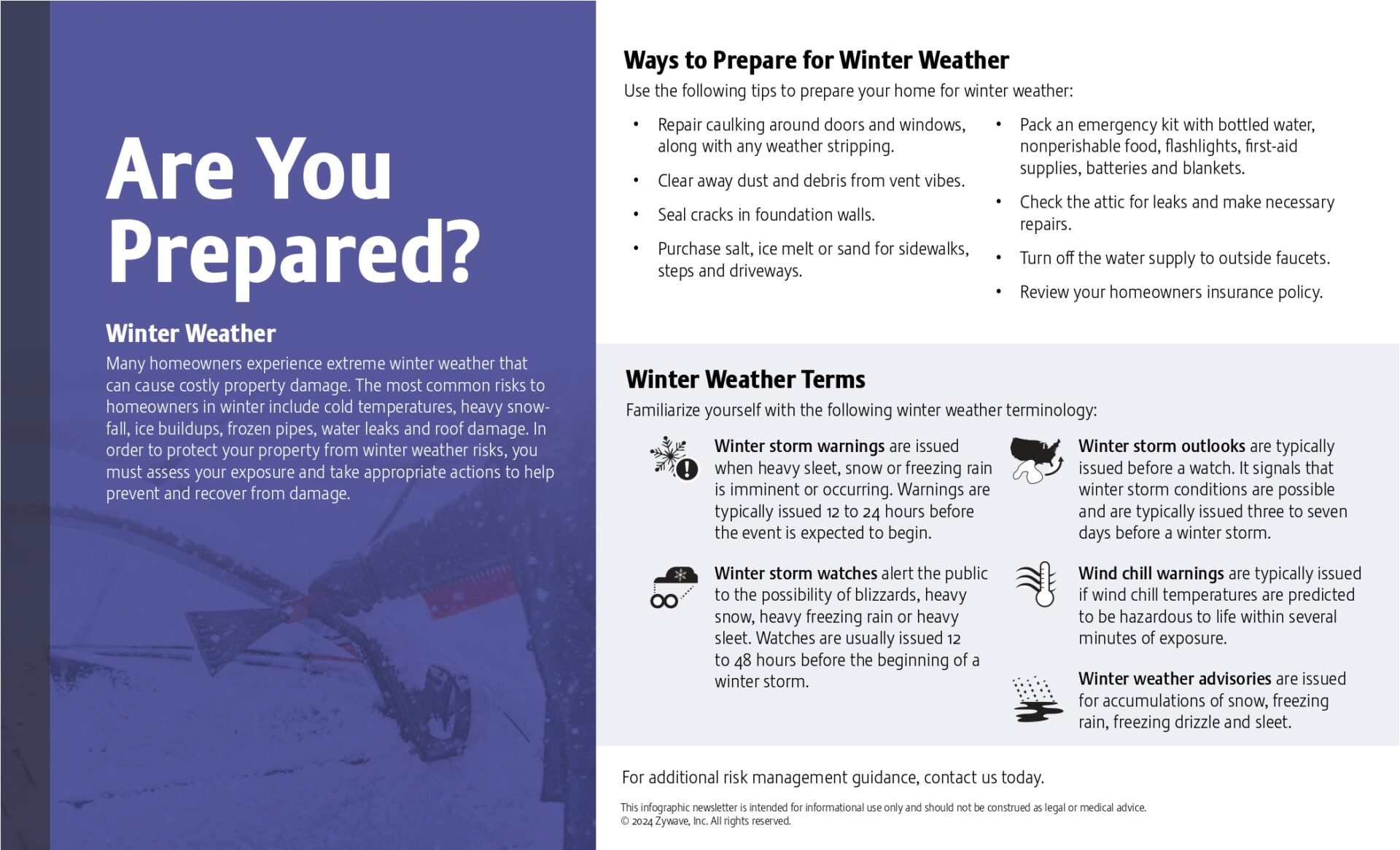Get ready for winter by safeguarding your home against common risks like freezing temperatures, heavy snow, and frozen pipes. This infographic offers valuable tips, from sealing cracks and packing an emergency kit to reviewing your insurance policy, so you can be fully prepared. Plus, you’ll learn the meaning behind winter weather terms to stay informed and secure during storms. Download the infographic today for detailed guidance on protecting your property this winter season!