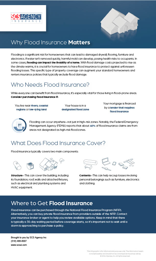 Flood insurance is essential for homeowners to protect against the significant risks and damages posed by flooding, which are not covered by standard insurance policies. It is especially important for those in flood-prone areas, but beneficial for everyone, as flooding can occur anywhere. Learn more about flood insurance and what it covers in this infographic.